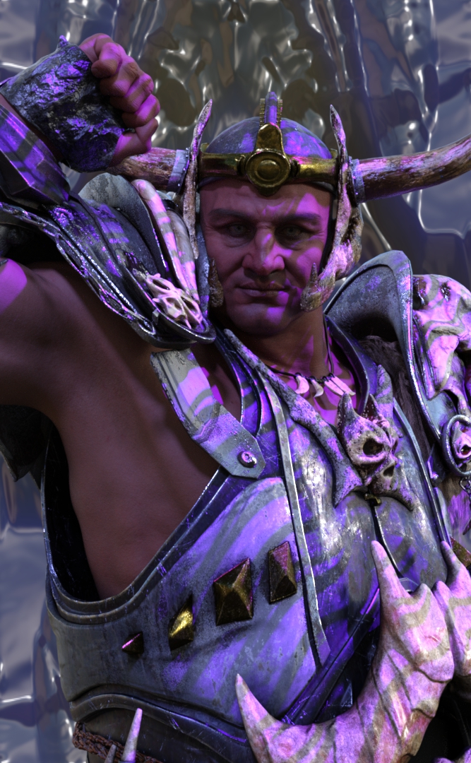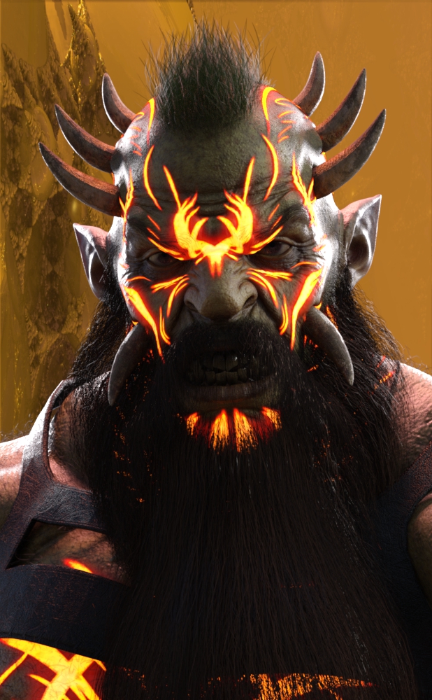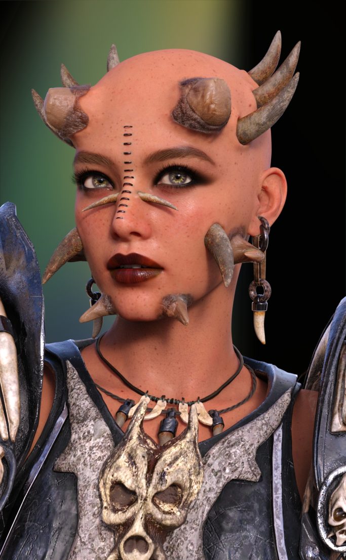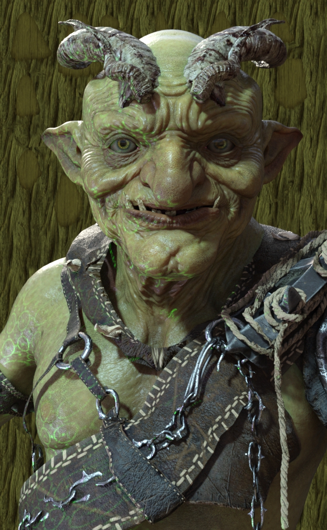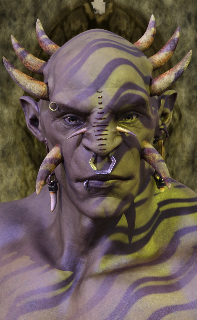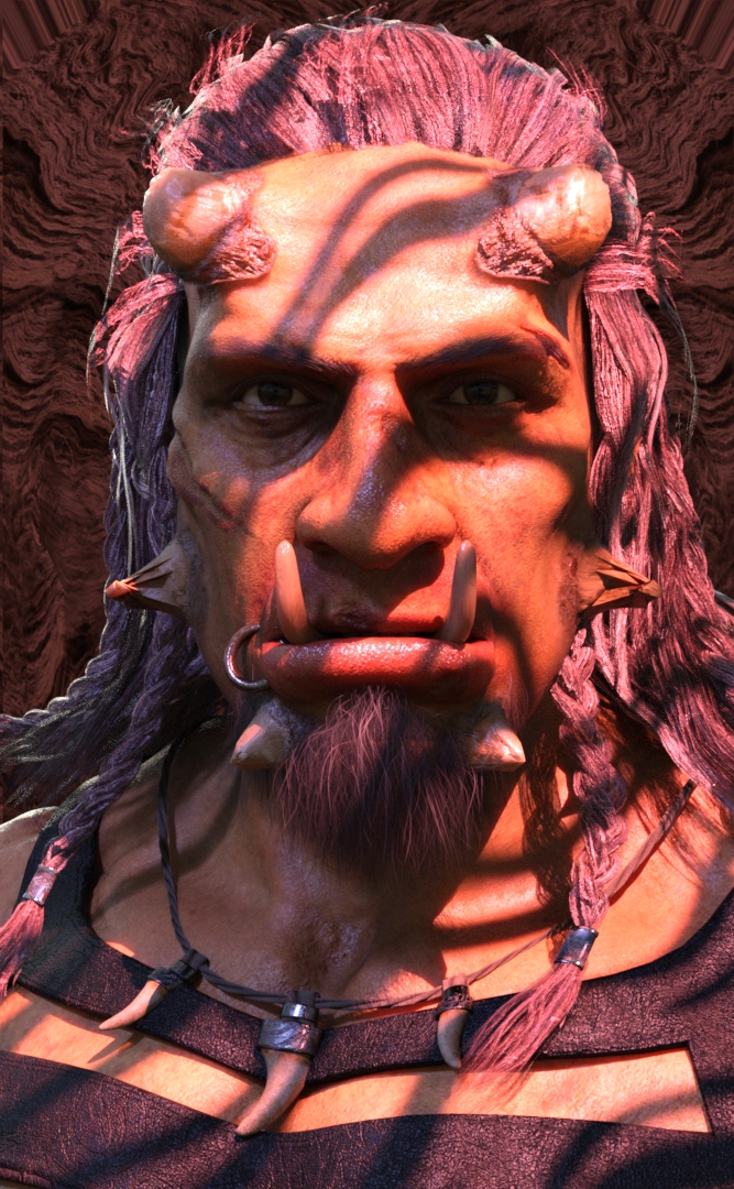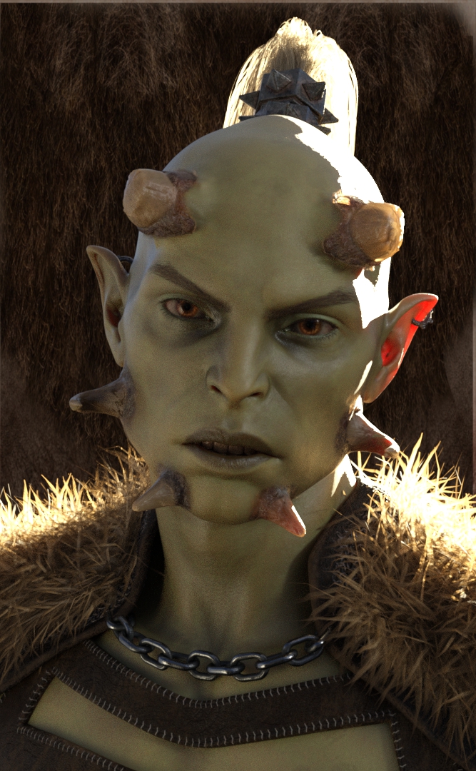 Genesis 9, Alba the Orc Model, Rendered in Daz Studio, Dome lighting, Macro Photo Background, Added Horns