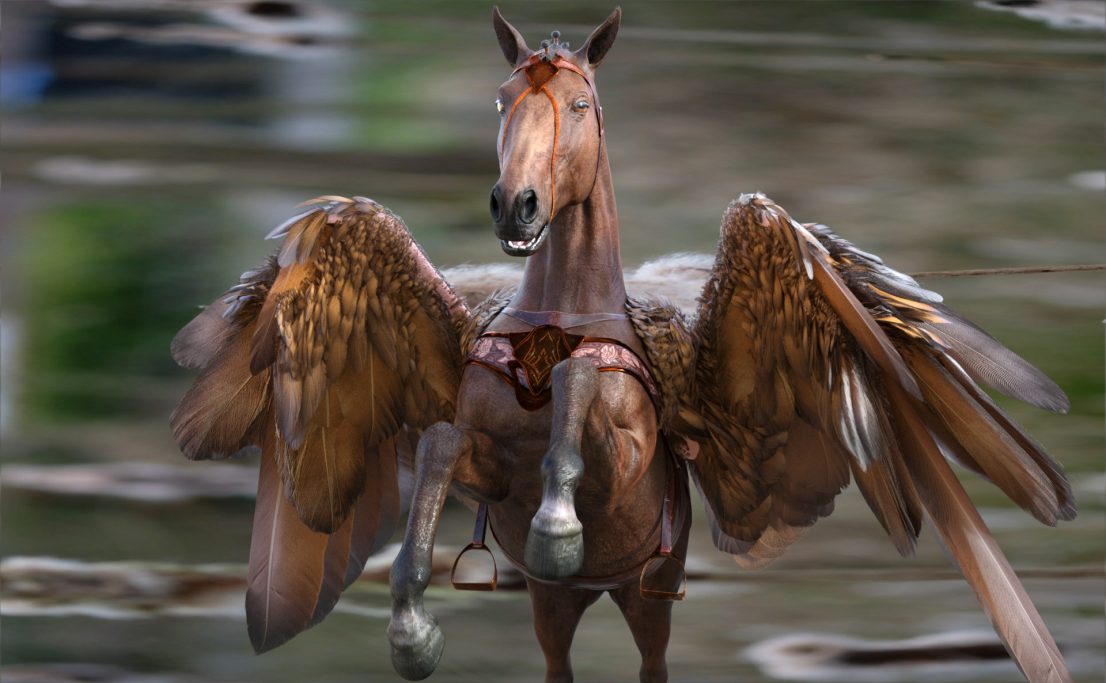Genesis 9, Daz Horse 3 Model, Rendered in Daz Studio, Dome lighting, Macro Photo Background, Pegasus Wings and textures