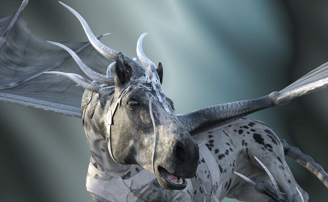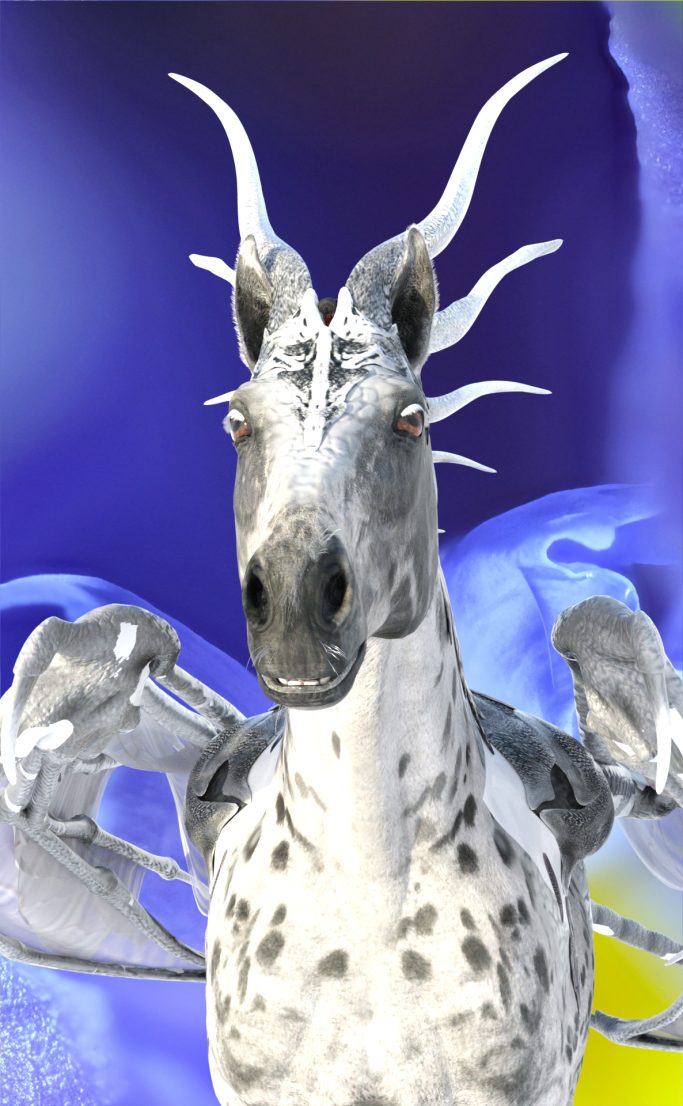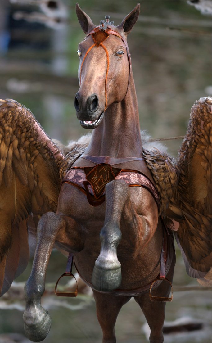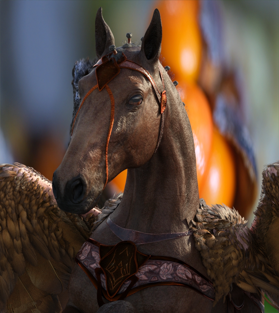 Genesis 9, Daz Horse Model, Rendered in Daz Studio, Dome lighting, Macro Photo Background, Pegasus wings and textures