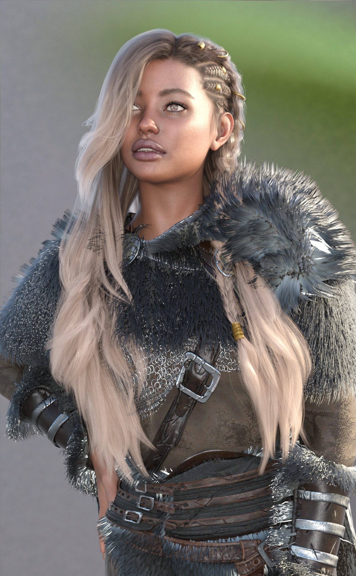 Genesis 9. Model CL Cleo, Rendered in Daz Studio using Iray, Dome Lighting, Macro background, toe thrasher clothes, Ardamir Hair